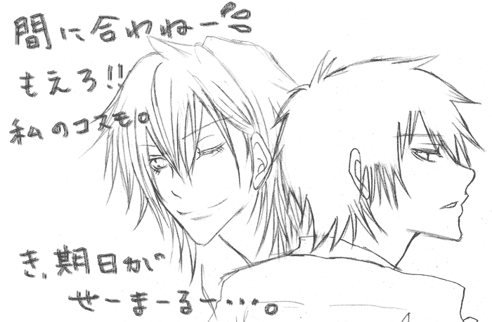 本日はついにぶっ倒れました、会社に着いてすぐ(笑)。何しに会社へ行ったのやら。上司に始業前に家まで送ってもらいまして、夕方まで寝てました。とはいえすることないんでログ絵のアップとかしてみましたv 明日も一応自宅療養でっす。社内の人間が一人辞めたので、最近仕事の比重が増えてましたからね。実は今の時点でジャンプもリボと銀魂とDグレ以外読めてないし。…まあ倒れたというか立ち上がれなくなっただけなんで、多分明日には元気になるはずです。