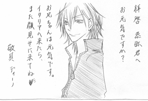 そうです、今日の落書きは師弟のイタリア再会記、みたいなね。日本に帰った愛弟子に宛てた手紙vv